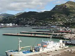 Lyttelton Port wharves 2, 3, 4, 5, 6, and 7. In the background at left is part of the oil terminal.