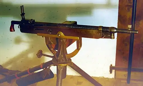 The Colt–Browning M1895, nicknamed "potato digger" because of its unusual operating mechanism, is an air-cooled, belt-fed, gas-operated machine gun that fires from a closed bolt with a cyclic rate of 450 rounds per minute. Based on an 1889 design by John Browning and his brother Matthew S. Browning, it was the first successful gas-operated machine gun to enter service.[1][2][3]