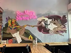 Maíz Molino's interior features a sign with text which translates to "Without corn, there is no country".[7] The menu has included pork cheeks in mole, short ribs with masa grits, and snake venom–infused sotol.[8]