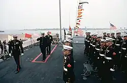 Ma Xinchun reviews an U.S. Marine Corps honor guard aboard an U.S. Navy ship.