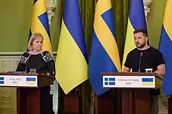 Following the 2022 Russian invasion of Ukraine in February, Sweden and the Social Democrats began to reevaluate their traditional position of neutrality.[69] The Social Democrats began a review of their policy which they intended to finish before summer of 2022.[70] On 15 May, the party announced that it backed the accession of Sweden into NATO, reversing its previous policy.[71] Andersson said Sweden did not want permanent NATO bases or nuclear weapons on its territory.[72] She welcomed the deal agreed by European Union leaders to ban more than 90 percent of Russian oil imports by the end of the year.[73]