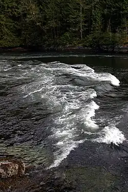 The Malibu Rapids forms the entrance to Princess Louisa Inlet and is also connected to the Jervis Inlet. The tidal flow of both inlets pass through this narrow and shallow passage that creates a fast moving (approximately 9 kn or 17 km/h) and strong tidal rapids during the peak flows. At slack tide, the entrance is virtually flat calm similar to the Skookumchuck Narrows near the entrance of the Jervis Inlet.