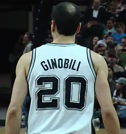 Emanuel David "Manu" Ginóbili (English: /ˈmæn ɪˈnbli/ MAN-oo jin-OH-blee,[3] Spanish: [ˈmanu ʝiˈnoβili];[4] born 28 July 1977[5]) is an Argentine former professional basketball player. Over a 23-year professional career, he played his first three seasons (1995–1998) in the Liga Nacional de Básquetbol, the top division of Argentine basketball. Thereafter, he went to Italy for four years (1998–2002), playing for Viola Reggio Calabria and Virtus Bologna. After being selected as the 57th overall pick in the 1999 NBA draft, Ginóbili joined the San Antonio Spurs (2002–2018), playing for them his entire 16-year career with the National Basketball Association (NBA). He has also represented Argentina on the international stage for 16 years (1998–2016). Credited for popularizing the Euro step move in the NBA,[6][7] he is considered one of the greatest players of all time.[8] He is also regarded as one of the greatest Latin American players, sixth man, and draft steals in NBA history.[9][10][11][21]