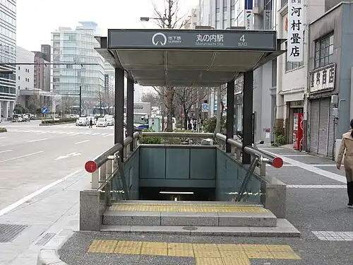 Marunouchi Station (丸の内駅, Marunouchi-eki) is an underground metro station located in Naka-ku, Nagoya, Aichi Prefecture, Japan operated by the Nagoya Municipal Subway.[1] The station is an interchange station between the Tsurumai Line and the Sakura-dōri Line, and is located 6.3 rail kilometers from the terminus of the Tsurumai Line at Kami-Otai Station and 2.4 rail kilometers from the terminus of the Sakuradōri Line at Taiko-dori Station.