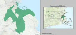 Massachusetts's 8th congressional district is located in eastern Massachusetts, including the southern fourth of Boston. It is represented by Democrat Stephen Lynch. For one congressional term (1791–1793), it served as the home district of the District of Maine. The district boundaries were significantly changed, as of the elections of 2012, due to redistricting after the 2010 census, with the old 8th district largely being shifted to the new 7th district.[3] The new 8th district comprises many of the communities of the old 9th district, as well as some easternmost Norfolk County communities and northernmost Plymouth County communities of the old 10th district.