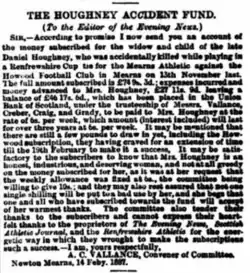 Fund raised for the late Daniel Houghney of Mearns Athletic, Glasgow Evening News, 14 February 1887