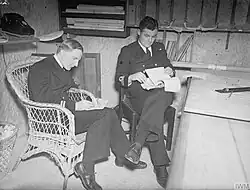 The commanding officer of P51, Lieut. Crawford (right), studying the latest reports on shipping movements with Lieut. E. Barlow