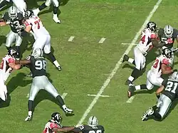 In his Falcon debut, Turner broke the Falcons' single game rushing record against the Detroit Lions on September 7, 2008, rushing for 220 yards on 22 carries with 2 touchdowns.[7] His 220 yards against the Lions marked the third-highest opening day rushing total behind O. J. Simpson’s 250 yards in 1973 and Arian Foster's 231 yards in 2010 and his rushing total is also the most in NFL annals by a player in his first game with a new team and surpassed the previous mark of 202 yards setting by running back Gerald Riggs on September 2, 1984. Coincidentally, Turner became the first Falcons offensive player of the week following an NFL season opening weekend since Riggs earned the honor after setting his record in 1984. He was named NFC Offensive Player of the Week for this performance.[8] On November 23, 2008, he set a personal record with 4 rushing TDs in a victory over the Carolina Panthers. He compiled 117 yards rushing during that same game.[9] His seventeen rushing touchdowns during the 2008 season broke the Atlanta Falcons' single season record of 14 set by Jamal Anderson in 1998, it is also the second-most in NFL history for a first season with a team behind only Eric Dickerson (18).[10] He finished the year with 1,699 yards (a 4.5 ypc avg) and 17 rushing touchdowns. He is the first Atlanta Falcon in history to start and finish a season with 200 yard rushing performances (220 against Detroit week 1 and 208 against St. Louis week 17).