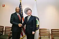 Woods with United States Secretary of Education Rod Paige in February 2002