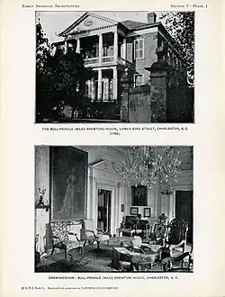 The Bull-Pringle [ Miles Brewton] House, Lower King Street, Charleston, South Carolina [1765] outside and the drawing room (Early American architecture — National Lead Company)