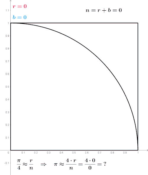 In this procedure, the domain of inputs is the square that circumscribes the quadrant. One can generate random inputs by scattering grains over the square, then performing a computation on each input to test whether it falls within the quadrant. Aggregating the results yields our final result, the approximation of π.