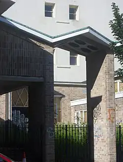 Architecturally, the church has been described as "in isolation not without merit, but too low and spreading" in the context of a closely built urban environment of tall 19th-century buildings.[33] The main façade of the building faced south, with a wide western bay and narrower eastern bay, both topped with shallow gables and separated by an arcade formed by narrow vertical brick slabs topped by a "saw-tooth overhanging roof reminiscent of Coventry Cathedral", which had opened in 1961.[33][34] Behind this arcade was a partly open courtyard. The larger, western part of the building was the church; the eastern section was used as a hall. Both of the southern walls of these bays had an "incised" pattern of vertical bands of recessed bricks.[33][34]