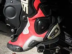 Motorcycle boots are associated with motorcycle riders and range from above ankle to below knee boots. They have an outside of a typical boot but a low heel to control the motorcycle. To improve motorcycle safety, motorcycle boots are generally made from a thick, heavy leather and may include energy absorbing and load spreading padding, metal, plastic and/or composite materials to protect the motorcycle rider's feet, ankles and legs in an accident. For use in wet weather, some boots have a waterproof membrane lining such as Gore-Tex or SympaTex.