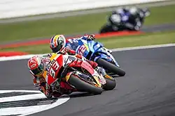 Marc Márquez, Álex Rins and Maverick Viñales fighting for the win at the 2019 British Grand Prix.