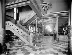 The interior featured a vestibule and a short flight of marble stairs that lead to the office floor. The great hall had a high ceiling. The floor was of marble. The sienna was set against slate in a carpet pattern. The office area had a large counter where arriving guests could register. The book stand had access to several periodicals and newspapers. The great fireplace contained huge burning logs.[6] The electric clock was lit at night, and the chandeliers illuminated halls and parlors, their supply of electricity generated from machines in the basement. The ice was made in huge condensers. Meals were ready at all hours. Restaurants above and below stairs were always open.[1]