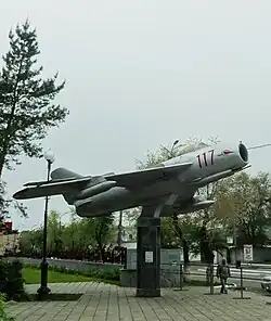 The museum building features a monument in front of it, which is a MiG-17 fighter jet. The plaque on the pedestal identifies it as the same type of aircraft that Yuri Gagarin flew as a cadet, although some sources mistakenly refer to it as a MiG-15[32] or MiG-15bis.[30] According to some sources, the monument was erected in 1963[32] near the college building on Sovetskaya Street, 1. It was later moved to its current location after being taken under protection by the Council of Ministers of the RSFSR in 1974. Today, it holds the status of a monument of federal significance.[2] In front of the building stands a bust of Ivan Polbin, while behind it there is a memorial to the school's hero graduates with name steles, reconstructed in 2007. Additionally, a memorial plaque to Yuri Gagarin is located on the building.[32]