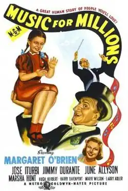 Music for Millions is a 1944 musical comedy film directed by Henry Koster and starring Margaret O'Brien, José Iturbi, Jimmy Durante, June Allyson, Marsha Hunt, Hugh Herbert, Harry Davenport, and Marie Wilson.[2][3] It was nominated for an Oscar for Best Original Screenplay in 1946.[4]