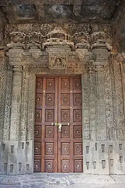 The highlight of the large hall are the bell shaped lathe turned pillars of dark grey stone (soap stone). So well polished are the pillars that they sparkle with reflected light. According to the Kamath, this is a standard characteristic of Western Chalukya pillar art, later to become popular with the Hoysala architects as well.[6] The main decoration on these pillars are the horizontal rings of moldings. There are other pillars on square bases whose shafts are octagonal or 16-sided with round capitals. The columns that stand between the two halls are extremely ornate and belong to an entirely different workmanship.[8] The ceiling in the large hall between pillars are highly decorative with designs such as rosettes with imaginary beasts (Kirtimukhas) at the four corners. Mention must be made of the central domed ceiling in the large hall which rises in concentric ornamental circles. The doorjamb and lintel decoration is worthy of mention, especially at the entrance to the closed hall from the south. The sanctum is now empty but would have at one time housed a linga, the universal image of the god Shiva. Though this temple has been called a Jain temple, according to Cousens, there is no trace of any images directly related to Jainism. On the contrary, there are numerous sculptures in relief of the Hindu gods such as Shiva, Vishnu, Ganapati, Brahma and Kali.[2]
