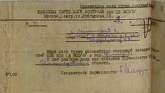Numerous documents from 1937–1938 in Natan Z. Strugatsky's personnel file reflect his personal struggle for reinstatement in the party ranks. A handwritten statement dated November 25, 1937, notes his trip to Stalingrad for an appeal conducted by the visiting commission of the Party Control Commission under the Central Committee of the VKP(b) in Stalingrad Oblast. He was issued a work certificate stating that Natan Zalmanovich "performs his duties conscientiously and accurately" and that he was tasked with leading two study groups on the Constitution and the Election Regulations for the Supreme Soviet of the USSR. The appeal was unsuccessful, but in 1938, Strugatsky made several more trips to Stalingrad and then to Moscow. His performance reviews consistently noted that he was a "capable and proactive worker", that he "initiated the scientific description of the department's rich collections", and that he took the lead in organizing traveling exhibitions based on the department's materials at houses of culture. However, he was unable to be immediately reinstated in the VKP(b), even though those who initiated his expulsion were themselves convicted as "enemies of the people".[49]