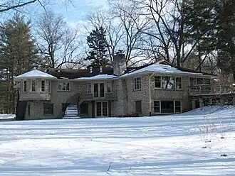 The single-story raised-ranch house, built from Anamosa limestone (dolomite), and poured concrete, shows Prairie School influence in the way it was incorporated into its location alongside the Iowa River. Both the main and lower levels of the house provided excellent views of the river.[2]