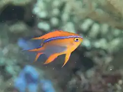 Adults can grow up to a maximum size of 10 centimetres (3.9 in).[2] They have 13 dorsal spines, 14 to 16 dorsal soft rays, 2 anal spines, and 13 to 14 anal soft rays.[2] Juveniles are orange with a black bottom and a blue line that extends from its snout to its caudal pentacle. Adults are more grayish with less orange spots and their line is less blue.