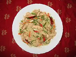 Nepali cuisine comprises a variety of cuisines based upon ethnicity, alluvial soil and climate relating to cultural diversity and geography of Nepal and neighboring regions of Sikkim and Gorkhaland. Dal-bhat-tarkari (Nepali: दाल भात तरकारी) is eaten throughout Nepal. Dal is a soup made of lentils and spices, bhat — usually rice but sometimes another grain — and a vegetable curry, tarkari. Condiments are usually small amounts of spicy pickle (achaar, अचार) which can be fresh or fermented, mainly of dried mustard greens (called gundruk ko achar) and radish (mula ko achar) and of which there are many varieties.[1] Other accompaniments may be sliced lemon (nibuwa) or lime (kagati) with fresh green chilli (hariyo khursani) and a fried papad and also Islamic food items such as rice pudding, sewai, and biryani. Dhindo (ढिंडो) is the national dish of Nepal, primarily made from flour of millet and is served with achar of gundruk 'dried spinach'. A typical example of Nepali cuisine is the Chaurasi Byanjan (Nepali: चौरासी व्यञ्जन) set where bhat (rice) is served in a giant leaf platter (patravali) along with 84 different Nepali dishes each served on small plates.[2] It is mostly fed during weddings and Pasni (rice feeding ceremony).