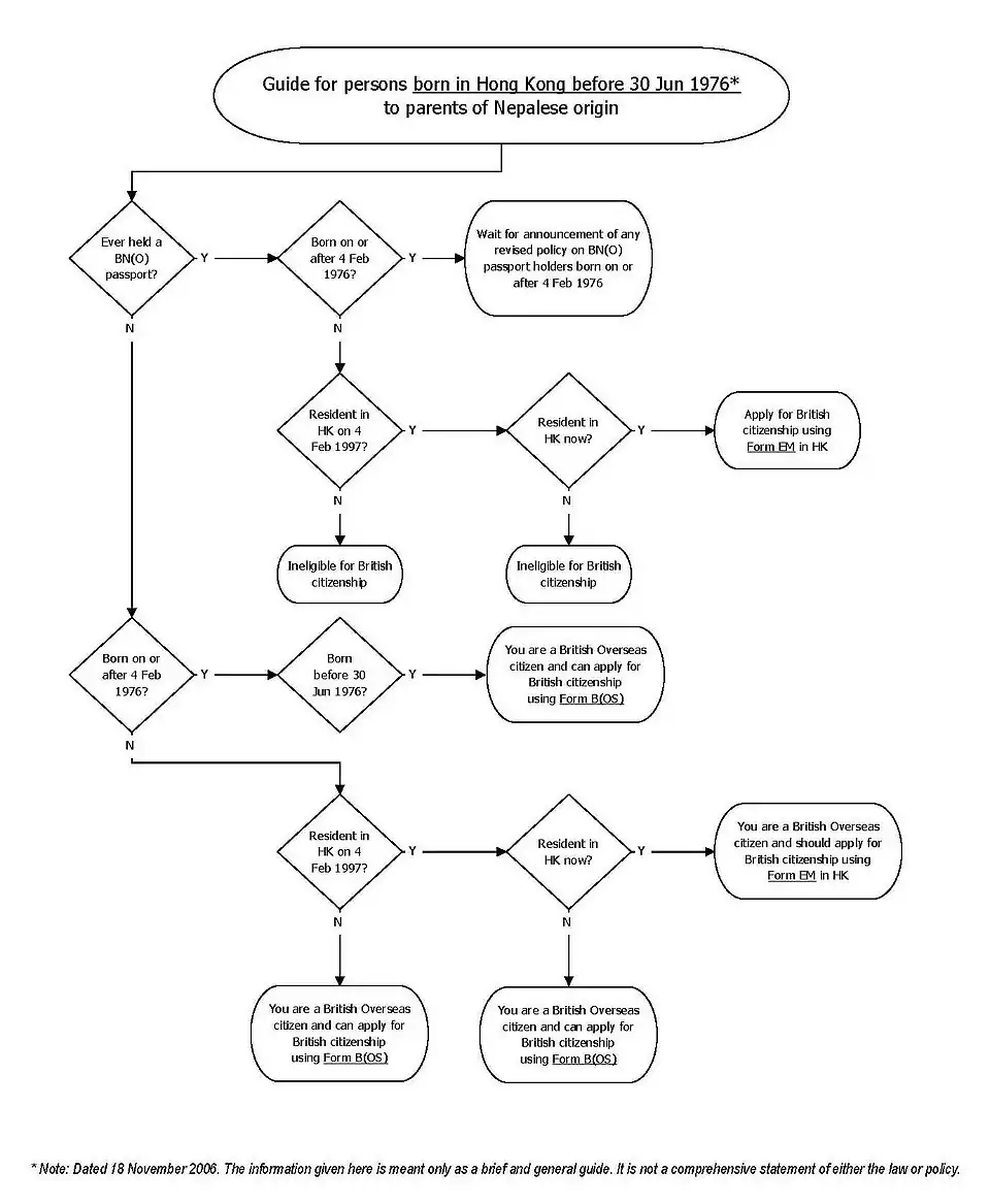 Recent clarification of Nepalese Citizenship law has meant a number of persons born in Hong Kong who failed to renounce their British nationality before the age of 21 and were previously thought to be citizens of Nepal are in fact solely British. The British Government has recently accepted that certain Nepalese passport holders born in Hong Kong before 30 June 1976 are British Overseas citizens, and can register for full British citizenship (with right of abode in the UK) if they wish to do so.