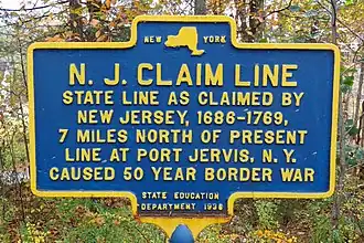 The New York – New Jersey Line War (also known as the N.J. Line War) was a series of skirmishes and raids that took place for over half a century between 1701 and 1765 at the disputed border between two American colonies, the Province of New York and the Province of New Jersey.