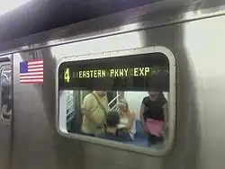 An R142 side sign indicating that this 4 train runs express on the IRT Eastern Parkway Line