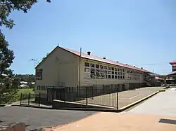 Changes to the school grounds have also occurred since WWII. These included the construction of stairs to the oval (the current concrete stairs date from the 1960s, replacing an earlier set).[95][96] Additions made to the Newmarket School Reserve when it increased to 8 acres (3.2 ha) 13.1 perches (330 m2) in 1963–4 included the extension of the playing field to its west, as part of works relating to the opening of the Newmarket State High school. Much of the bank excavated during the 1930s along the southern edge of the oval was removed or altered at this time.[97][98] New tennis courts and a shelter shed were completed between 2002 and 2004.[99][93] More recent buildings added to the school grounds are located along the Banks Street boundary and around former netball courts in the southeast corner. In the area in front of Block A's entrance portico garden beds have been created, early paths have been paved or laid with bitumen, and several memorials have been established.[94][1]