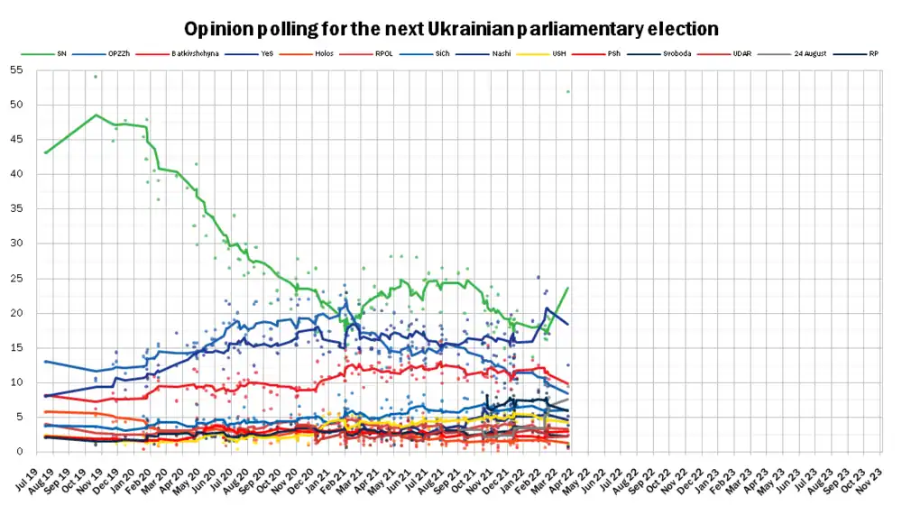 On 20 March 2022, the activities of several political parties were suspended by the National Security and Defense Council of Ukraine for the period of martial law:[31][32]