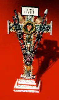 His religious pieces inserts emblematic items from Peruvian culture, for example, the Crucifix (cf. below section) with the coca leaves, and the shaman piece (cf. § Curandero (shaman)) with the guinea pig (cuy)[4]