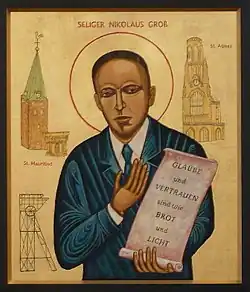 Nikolaus Gross (German: Groß) (30 September 1898 – 23 January 1945) was a German Roman Catholic.[1] Gross first worked in crafts requiring skilled labor before becoming a coal miner like his father while joining a range of trade union and political movements.[2] But he soon settled on becoming a journalist before he got married while World War II prompted him to become a resistance fighter in the time of the Third Reich and for his anti-violent rhetoric and approach to opposing Adolf Hitler. He was also one of those implicated and arrested for the assassination attempt on Hitler despite not being involved himself.[3][4]