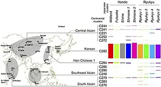 29. ^ Takeuchi F, Katsuya T, Kimura R, Nabika T, Isomura M, Ohkubo T, Tabara Y, Yamamoto K, Yokota M, Liu X, Saw WY, Mamatyusupu D, Yang W, Xu S, Teo YY, Kato N (2017). "The fine-scale genetic structure and evolution of the Japanese population". PLOS ONE. 12 (11): e0185487. Bibcode:2017PLoSO..1285487T. doi:10.1371/journal.pone.0185487. PMC 5665431. PMID 29091727.