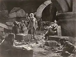 Approximately 7,500 extras worked on the film.[4] During the filming of the climactic flood scene, the 600,000 US gallons (2,300,000 L; 500,000 imp gal) of water used was so overwhelming that three extras drowned, one was so badly injured that his leg needed to be amputated, and a number suffered broken limbs and other serious injuries, which led to implementation of stunt safety regulations the following year.[5] Dolores Costello caught a severe case of pneumonia. Thirty-five ambulances attended to the wounded.[6]
