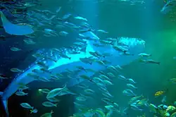 In 2010, captivity whale sharks in the panoramic fish tank of the new facility "Blue World" is started and aquariums have captivity to this day.[1][6] also captivity large pelagic fish such as bluefin tuna. In the winter season after 2013, aquariums installed multiple kotatsu in front of the fish tank of "Blue World" and adopted a system to observe fish while warming the body.[7] Nine days after the 2024 Noto earthquake, a male whale shark at the attraction died which officials attributed to equipment damage leading to poor living conditions in the tank.[8] The next day, a female individual was also found to be dead.[9]