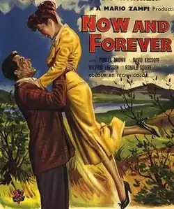 Now and Forever is a 1956 British drama film directed by Mario Zampi and starring Janette Scott, Vernon Gray and Kay Walsh.[2][3] It was written by R.F. Delderfield and Michael Pertwee based on the 1953 play The Orchard Walls by R.F. Delderfield, and was Scott's first adult role after a career as a child star in Britain.[4] The screenplay concerns an upper-class girl who becomes romantically involved with a garage mechanic, and they head for Gretna Green to elope.