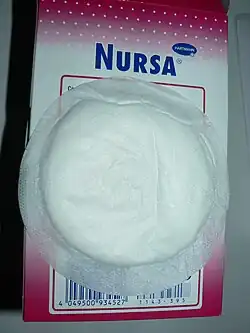 A nursing pad (or breast pad) is a cloth or disposable pad worn against the nipple and breast of a nursing mother to absorb any milk that may leak between feedings. It is inserted between the bra and the breast. Disposable pads are common and located easily online or in specialty stores. Reusable cloth pads can be washed and used over. These may be less expensive. Changing the pad when it is wet will keep the nipple clean and dry.[1]