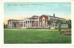 In March 1926, Oatland Island was selected by the Order of Railway Conductors to be the site for the construction of a new $1M retirement home for indigent[5] and "aged conductors and their wives" and widows of conductors.[6] That December, it was announced that in addition to the construction of the home, a bridge would be built to connect the island in a more efficient way to Savannah.[7] The contract was granted to the James Stewart Company, based in New York City, with construction to begin in March 1927.[8] Otis Elevator Company received the elevator contract. The finished brick building was two stories high, containing 62 bedrooms, 36 bathrooms, communal living and dining spaces, and a medical department with surgical capabilities.[9] The home opened in November 1927, with the first group of 25 conductors and their wives arriving in Savannah by train.[10]