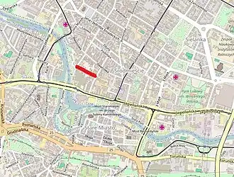Located in downtown district, the street unfolds on an approximate south east - north west axis, parallel to Dworcowa Street, from Warmińskiego street on the east to Marcinkowskiego street on its western tip.