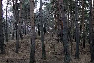 Hayashi Castle (林城, Hayashi-jō) was constructed by Ogasawara Kiyomune in 1459 to replace the smaller Igawa Castle. It is located on a ridge extending northwest from the Takato mountains, in the southeast portion of the modern city of Matsumoto. The castle is actually a double fortification sandwiched in a small valley between two ridges. The northern ridge contained the larger fortification, named the "Hayashi Large Castle" which was the residences of the Ogawasawara lords.[2][3][4] The southern ridge was approximately 500 meters away, and contained the smaller fortification, named the "Hayashi Small Castle", which was the main defensive center.[5][6][7]