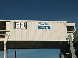 An oil well dog house is the steel-sided room adjacent to an oil rig floor, usually having an access door close to the driller's controls. This general-purpose shelter is a combination tool shed, office, communications center, coffee room, lunchroom, and general meeting place for the driller and his crew. It is at the same elevation as the rig floor, usually cantilevered out from the main substructure supporting the rig.[1]