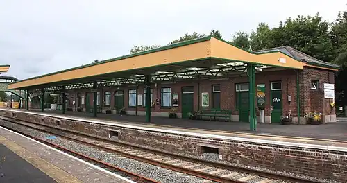 Okehampton railway station is a terminus railway station on the Dartmoor line serving the town of Okehampton in Devon, England. The station closed to regular traffic in 1972, but heritage and occasional mainline services ran from 1997 to 2019. Regular railway services resumed in November 2021.