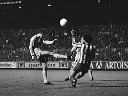 In European competitions, they managed to eliminate Cagliari in the 1972–73 UEFA Cup, a major force in Italian football during the late 1960s and the early 1970s, (1970 Serie A Champions, 1972 Serie A title contenders), with world-class Italian international players like Gigi Riva, Angelo Domenghini, Enrico Albertosi, Pierluigi Cera, Sergio Gori and Fabrizio Poletti.[65] Olympiacos managed to beat Cagliari twice, 2–1 in Piraeus and 1–0 in Cagliari, becoming the first ever Greek football club to win on Italian soil.[65] In the next round they faced the competition's defending champions Tottenham Hotspur, who were undefeated for 16-straight games in all European competitions. Olympiacos did not manage to qualify against Spurs, but they managed to get a 1–0 win in Piraeus, which ended Tottenham's undefeated streak and marked the first ever victory of a Greek football club against an English side.[66] Two years later, Olympiacos entered the 1974–75 European Cup and they were drawn to face Kenny Dalglish's Celtic, one of the strongest teams in European football at that time[67] and semi-finalists of the previous season. The first leg was played in Celtic Park, where Celtic had never been defeated, running an undefeated streak of 36 straight home games in all European competitions (27 wins, 9 draws) from 1962 to 1974. Olympiacos took the lead through Milton Viera's strike in the 36th minute, with Celtic equalising late in the game.[68] The away draw gave Olympiacos the advantage and they finished the job in Piraeus, after a spectacular 2–0 win against the Scottish Champions with Kritikopoulos and Stavropoulos finding the net.[69] In the next round, they were drawn to play against Anderlecht for a place in the quarter-finals of the competition. Anderlecht won the first leg with 5–1 and Olympiacos' task seemed impossible. In the second leg in Greece, however, Olympiacos put on a dominant display and almost reached a winning score in a match that was marked by referee Károly Palotai's decisions.[70] Olympiacos beat Anderlecht 3–0, while Palotai disallowed four Olympiacos goals[71] and did not give at least three clear penalties committed by Anderlecht players,[72] while Stavropoulos was shown a red card for no good reason.[73] The match is widely known in Greece as the "Palotai massacre"[74][75] with Olympiacos coming close to one of the biggest comebacks in European Cup history.