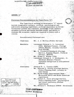 Team C included Navy Vice Admiral Richard L. Conolly, LTG L. L. Lemnitzer USA, Russia expert and future ambassador to Vietnam and Italy G. Frederick Reinhardt, Kilbourne Johnston, COL Andrew J. Goodpaster USA, Leslie S. Brady, COL Harold K. Johnson USA