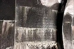 There are three inscriptions found on the vestibule, one is written in Persian, one in Arabic and the other is written in Armenian. The undated Persian inscription written upon the half-rounded lintel of the entrance was hastily cut into the stone and only partially legible, and while the Arabic inscription has been published, it is no longer legible and only faint traces remain. However, the Armenian inscription found at the eastern interior wall, just past the entrance to the upper right is legible and reads the following:[2]