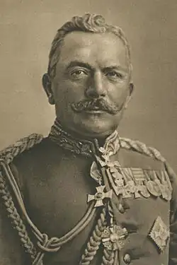 The corps was then transferred to the Eastern Front and assigned to the 11th Army under August von Mackensen for the Gorlice–Tarnów Offensive.[29] The X Army Corps was initially the 11th Army's reserve, but on the second day of the offensive, Emmich led a reinforced corps, consisting of the 11th Bavarian Infantry Division, the 20th Infantry Division and the 119th Infantry Division, into battle against the Russians.[30] The Russians were forced back, and Emmich's corps advanced, crossing the San in mid-May. On 14 May 1915, the Kaiser awarded Emmich the Oakleaves to the Pour le Mérite.[31]