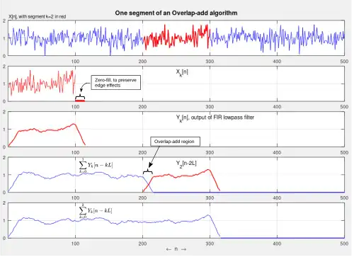 Fig 1: A sequence of five plots depicts one cycle of the overlap-add convolution algorithm. The first plot is a long sequence of data to be processed with a lowpass FIR filter. The 2nd plot is one segment of the data to be processed in piecewise fashion. The 3rd plot is the filtered segment, including the filter rise and fall transients. The 4th plot indicates where the new data will be added with the result of previous segments. The 5th plot is the updated output stream. The FIR filter is a boxcar lowpass with samples, the length of the segments is samples and the overlap is 15 samples.