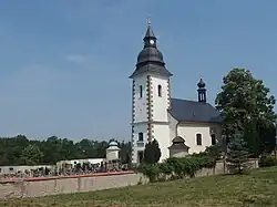 The main sight of the village is the Church of Our Lady of Sorrows. It was built in 1753. Opposite the church is the manor garden with a gazebo and a bust of Philipp Kinsky (1742–1827), the founder of the garden and the owner of the manor for more than 50 years.[4]