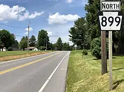 PA 899 begins at an intersection with PA 36 in Barnett Township, Jefferson County, heading north on a two-lane undivided road. The route passes between woods to the west and fields to the east before heading through forested areas, turning to the northeast.[2][3] The road crosses the Clarion River into Barnett Township in Forest County and turns northwest at Clarington, running along the northeast bank of the river. PA 899 turns north away from the river and continues through more forests. The road winds northwest through more wooded areas with occasional fields, passing through Redclyffe. The route crosses into Jenks Township and continues north through more forests with some fields and homes. PA 899 turns northeast and crosses an abandoned railroad line, passing through Roses before turning north and ending at PA 66.[2][4]